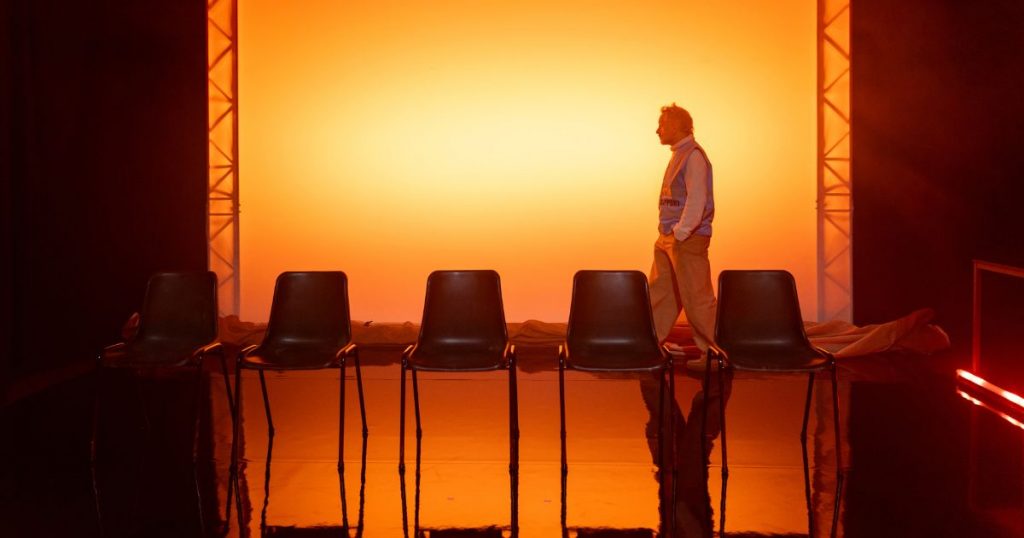 Robin Simpson carries the entire production, narrating the story from the perspective of Sam, a support dog. He describes the world through sensation, and colour – explaining how he sees human emotions visually. For example, anxiety may glow amber, while feelings can shift and change in hue.